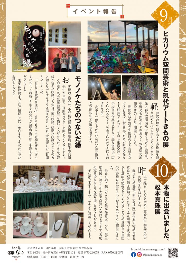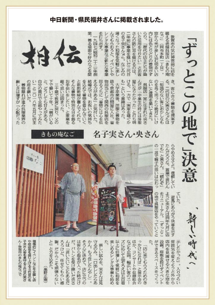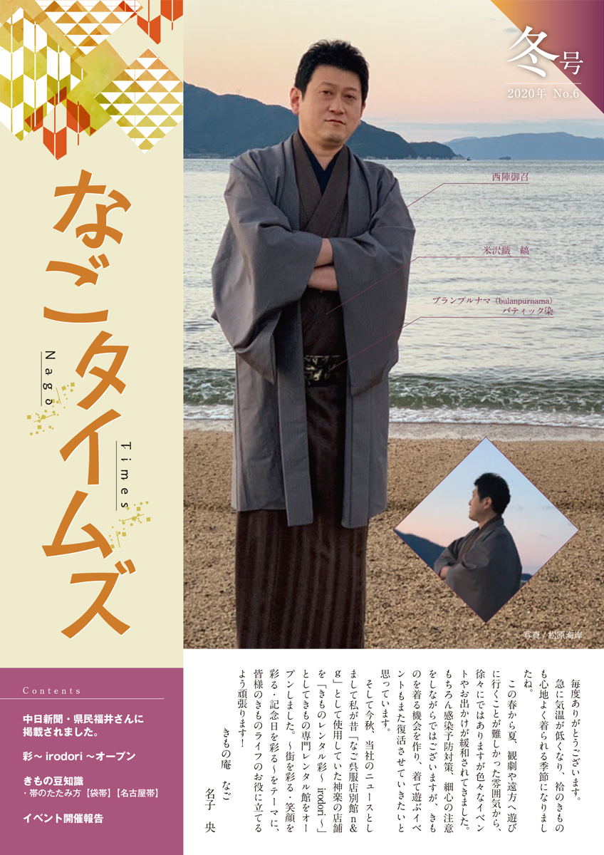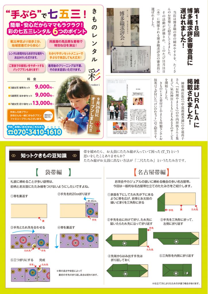 そして今秋、当社のニュースとしまして私が昔「なご呉服店別館n&g」として使用していた神楽の店舗を「きものレンタル彩〜irodori 〜」としてきもの専門レンタル館をオープンしました。〜街を彩る・笑顔を彩る・記念日を彩る〜をテーマに、皆様のきものライフのお役に立てるよう頑張ります!