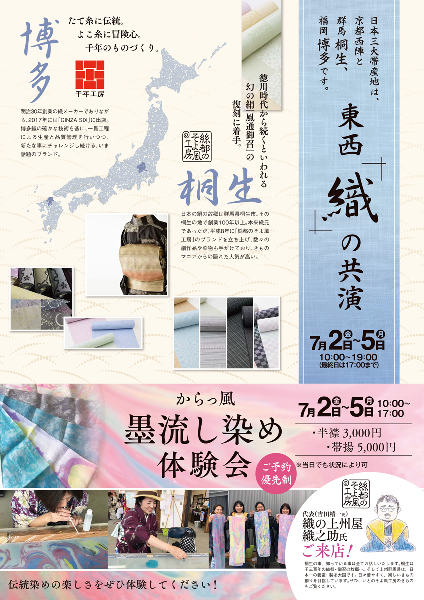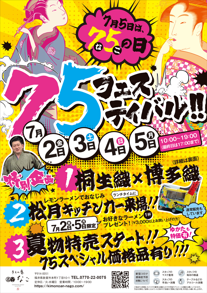 7月5日は『なご』の日!75フェスティバル!! 2021年6月29日 イベント 7月2日(金)から7月5日(月)までの4日間、75フェスティバルを開催いたします! 特別企画1. 桐生織×博多織2. 松月キッチンカーランチタイムに来場3. 夏物特売スタート!75スペシャル価格品有り! 詳細はチラシをご覧ください。皆様のお越しをお待ちしております。 ※期間中営業時間について 10:00〜19:00(最終日5日は17:00までとなります)