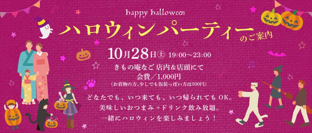 どなたでも、いつ来ても、いつ帰られてもOK!美味しいおつまみ+ドリンク飲み放題。一緒にハロウィンを楽しみましょう! 日時:10/28(土) 19:00~23:00場所:きもの庵なご 店内&店頭にて会費:1,000円(お着物の方、少しでも仮装っぽい方は500円)