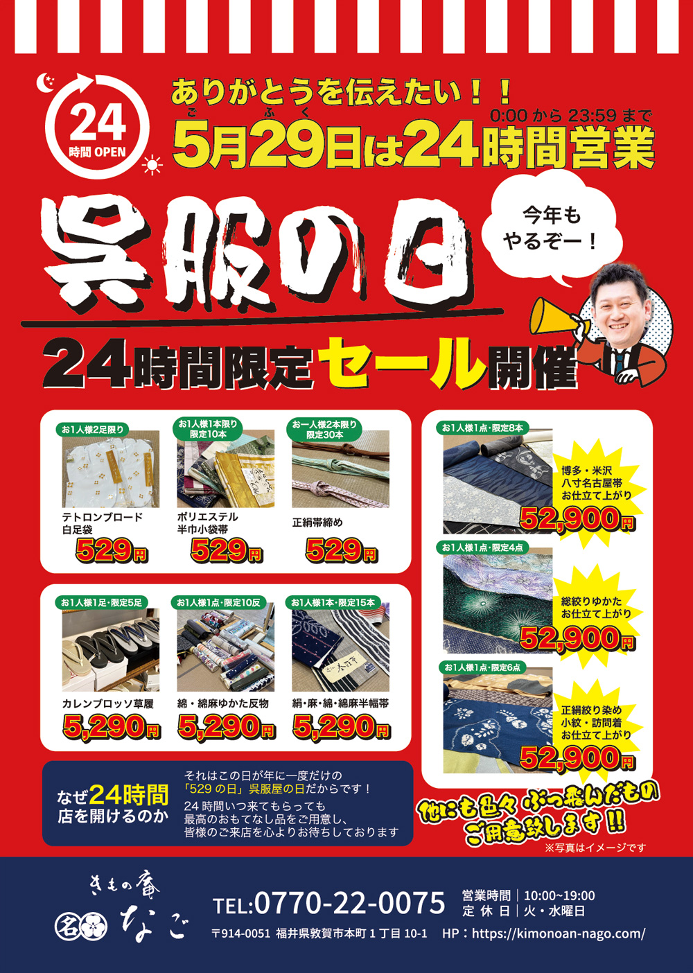 5/29は呉服の日 24時間限定セール開催! 2023年5月25日 イベント 今年もやります!呉服の日24時間限定セール! 5月29日(月)は0:00~23:59まで24時間営業いたします。 24時間いつ来てもらっても最高のおもてなし品をご用意し、皆様のご来店を心よりお待ちしております。