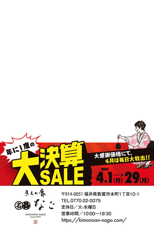 4月まるまる1ヶ月間【大決算SALE】のお知らせ 2024年3月28日 イベント 年に1度の大決算SALEのお知らせです!大感謝価格にて、4月は毎日大放出!!※一部商品を除く 期間:2024年4月1日(月)~29日(月) また、4月は毎日19:00頃からYoutubeチャンネル(なごちゃんねるライブ)にてお得情報を配信します! なごちゃんねるはこちら