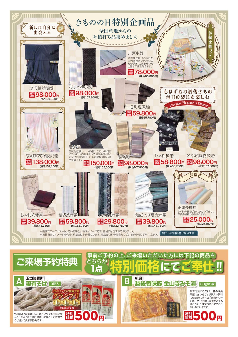 さらに今回は、皆様に今一度きものに袖を通すきっかけとなってほしいという思いのもと、きものの日限定企画として和装小物からフォーマル・カジュアル着物まで、特別価格品もご用意しました。